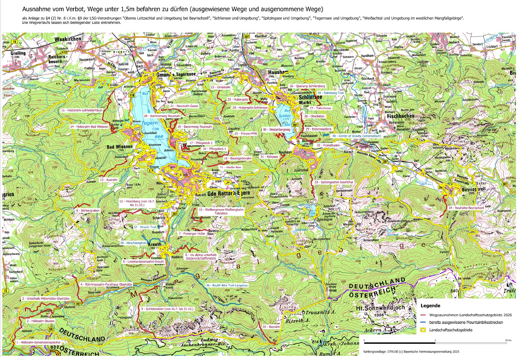 Der Landkreis Miesbach schreibt seine Landschaftsschutzgebiete (LSG) fort – und will in diesem Rahmen 35 Strecken neu für die Mountainbikenutzung freigeben. Wildes Bayern hat dazu ausführlich und kritisch fachlich Stellung bezogen. Grundsätzlich sind die Gebiete „Egartenlandschaft um Miesbach“, „Oberstes Leitzachtal und Umgebung bei Bayrischzell“, „Schliersee und Umgebung“, Spitzingsee und Umgebung“, „Tegernsee und Umgebung“ sowie „Weißachtal und Umgebung im westlichen Mangfallgebirge“ aus unserer Sicht unbedingt schützenswert, und wir begrüßen, dass sie fortgeschrieben und teilweise ausgeweitet werden.