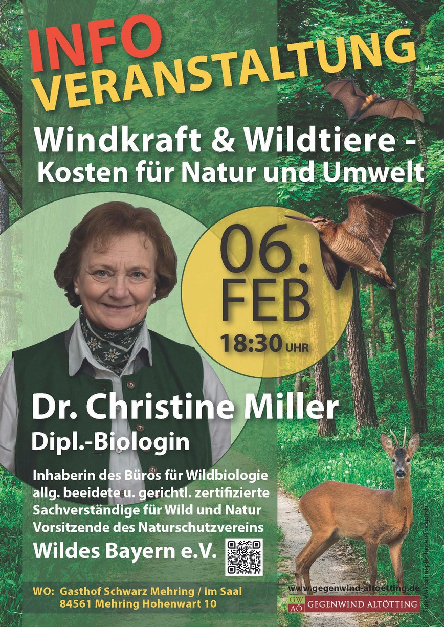 Was kostet Windkraft unsere Natur und Wildtiere? Aufschluss darüber gibt die Wildes Bayern-Vorsitzende, Wildbiologin Dr. Christine Miller in einem Vortrag am 6. Februar um 18.30h in 84561 Mehring-Hohenwart. Die Veranstaltung von „Gegenwind Altötting“ findet im Gasthof Schwarz statt.